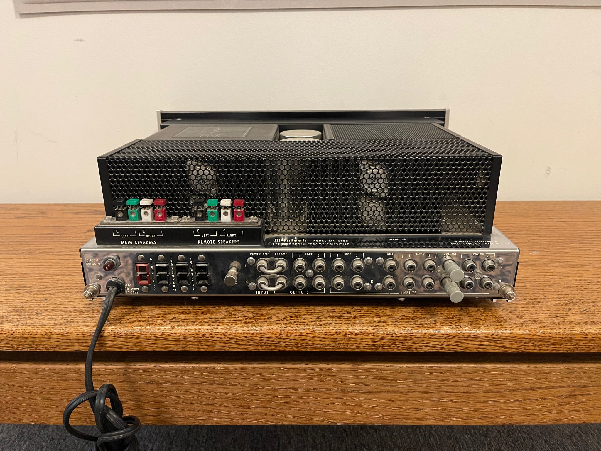 The McIntosh MA6100 is a classic integrated amplifier that captures the rich, full-bodied sound and timeless styling that made vintage McIntosh gear so respected. Built during the golden age of hi-fi, the MA6100 combines solid power, smooth musicality, and the unmistakable McIntosh look with its black glass faceplate, illuminated blue meters, and beautifully finished controls.